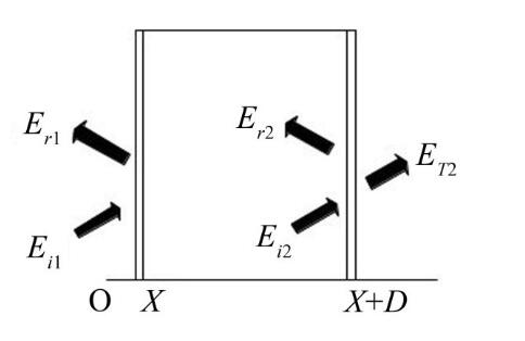 如图1所示, 从电容器内部传递出来的声波, 一部分声能Er1被反射, 另一部分声能Ei1引起隔声腔第一块钢板振动, 并对隔声腔中的空气层辐射噪声。